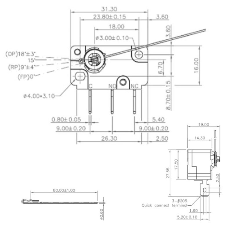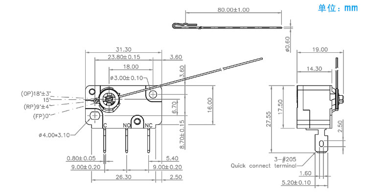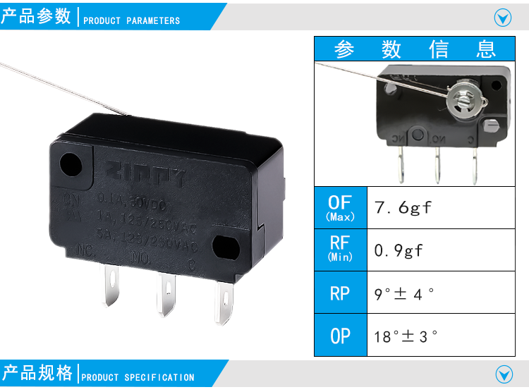 中國臺灣原裝長針微動老鼠尾開關 機械壽命:1000萬次 電流電壓:5A 125/250VAC